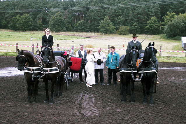 zwei Friesen aus Waren gekommen und eine zweite Kutsche standen bereit um die Körkommission und “Königin Luise” in den Ring zu fahren. Es regnete in Strömen. Die Pferde waren alle pechschwarz und glänzend.